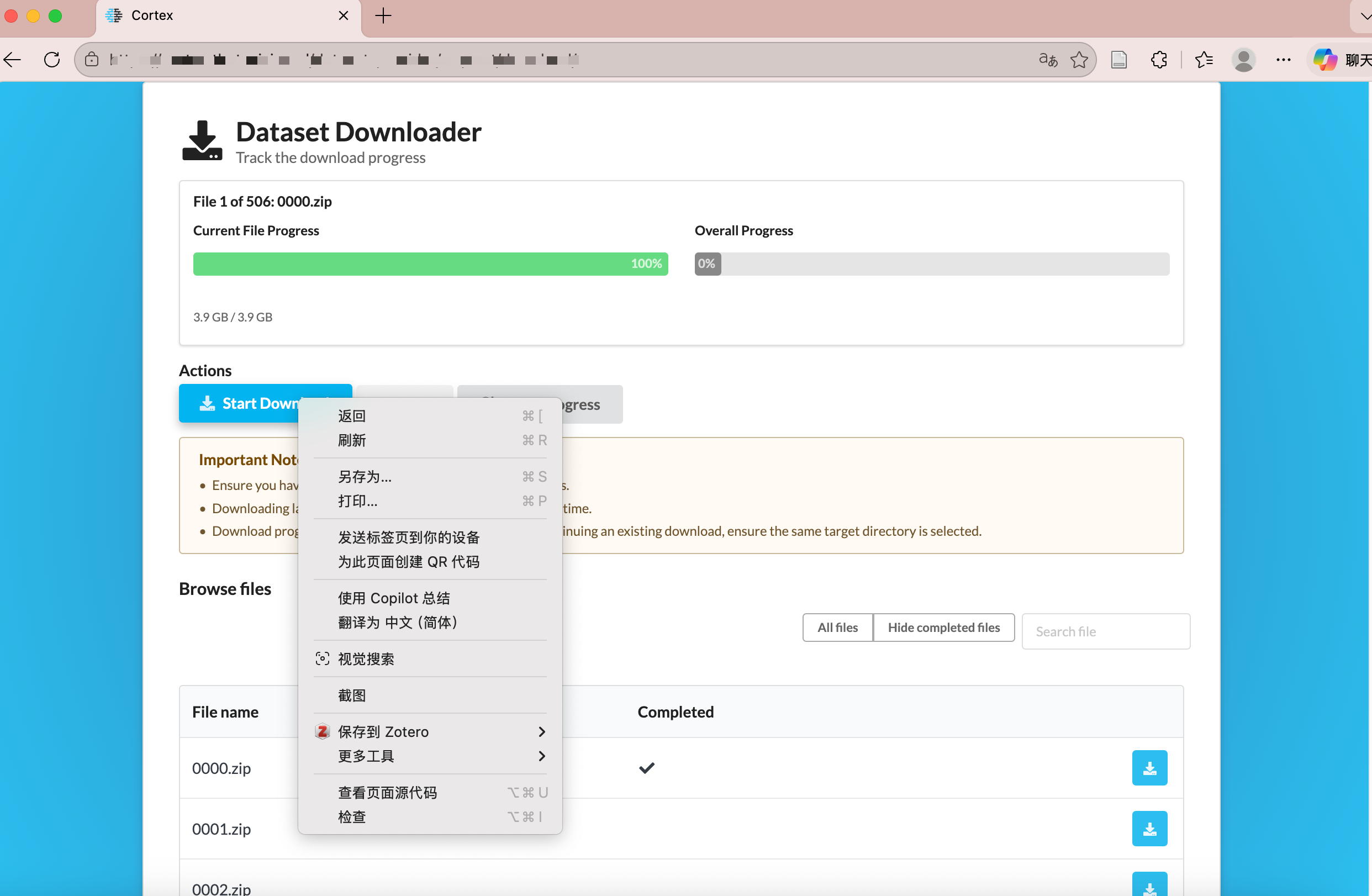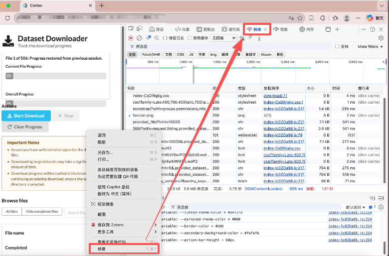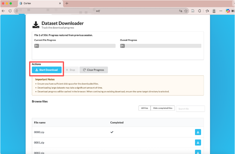 整个过程需要注意: 不要一上来就跑几百个文件,最好先只测试一个文件,确认拿到的确实是临时下载地址,确认下载下来的也确实是目标文件,而不是 HTML 错误页或者 JSON,再逐步放大到前几个、前十几个,最后再全量下载。对于几百 GB 甚至几 TB 的数据集,这一步尤其重要,因为临时链接可能过期,会话可能失效,磁盘空间也可能不够,很多问题只有在真实写盘的时候才会暴露出来。