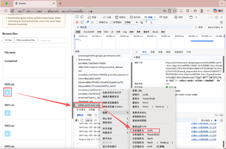 接下来就可以从这条 cURL 里把真正可复用的部分摘出来。通常最值得关注的是 -b '...' 里的 Cookie、请求头里的 CSRF、referer / origin、生成下载地址的接口 URL,以及这个接口到底是 GET 还是 POST,是否还需要 --data-raw '{}' 之类的请求体。不同网站的接口长得会不一样,有的按文件 id 获取下载地址,有的按 uuid 获取,有的是先列文件再逐个生成下载 URL,也有的网站会一步直接返回预签名下载链接。所以这里不要把某一个站点的 URL 结构直接当成通用规则,通用的方法只是先把这条链路还原出来,再改写成脚本。